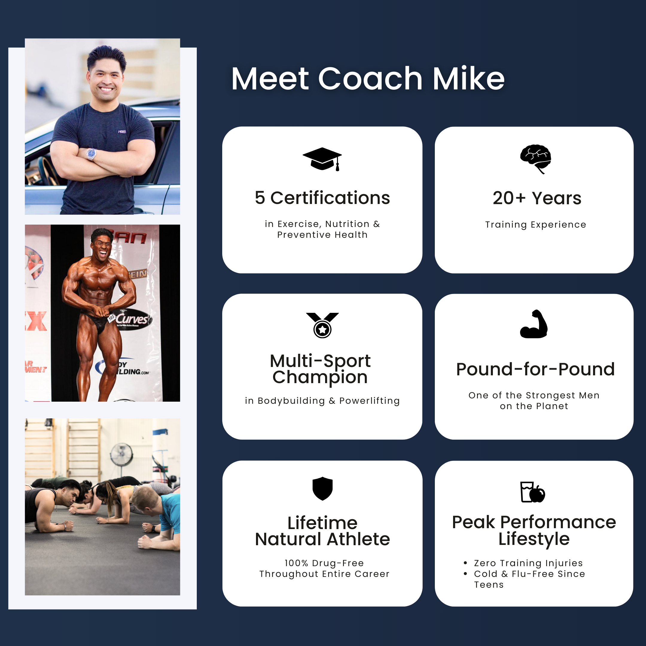Prior to becoming a fitness expert, Mike was a champion athlete in not one but two different sports (bodybuilding and powerlifting) capturing a total of 8 national and world titles - making him one of the strongest men in America, all while maintaining the title as a lifetime drug-free athlete.
